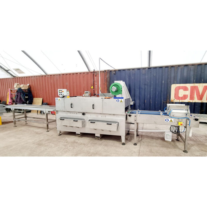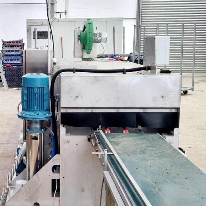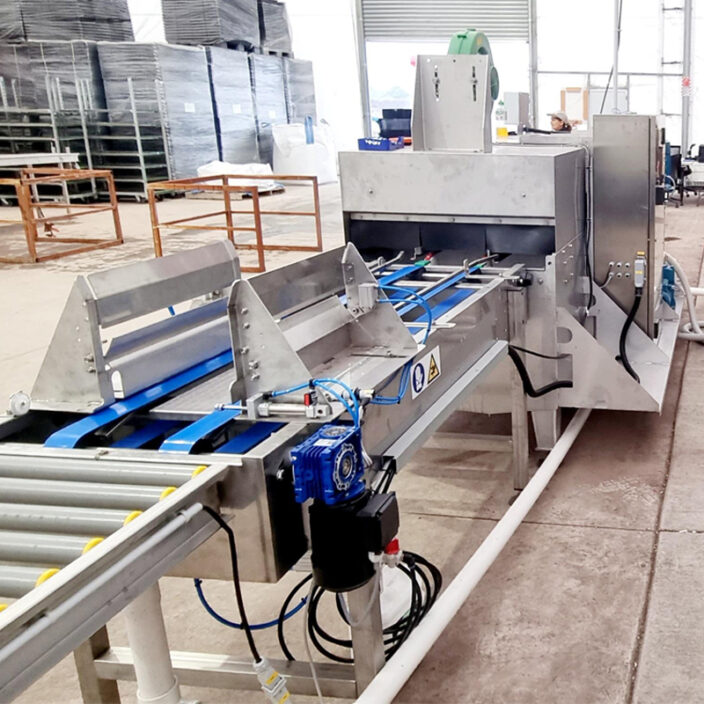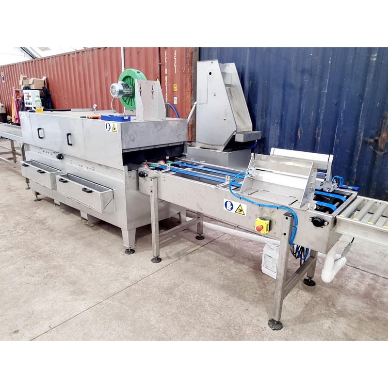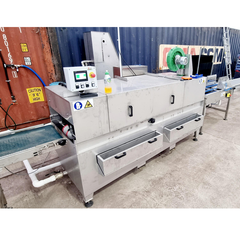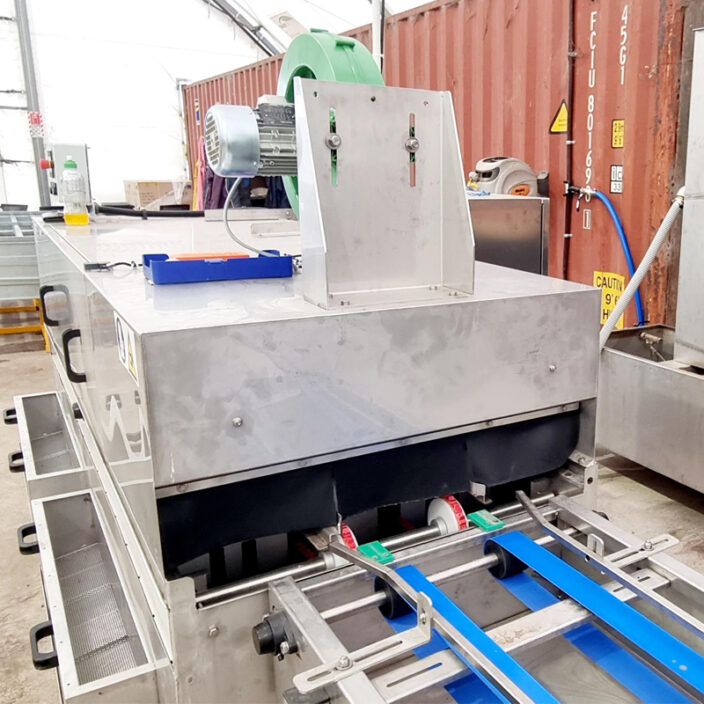 THIS IS A MODULAR LINE & THE FULL OPTIONAL VERSION CONSISTS OF: • Empty trays De-stacker Unit • Washing tank with double drawer filter • Vertical centrifugal pump • High capacity external filter • Drying Fan unit to eliminate the water dripping before disinfection. • Disinfection unit • Stacking and final collecting roller