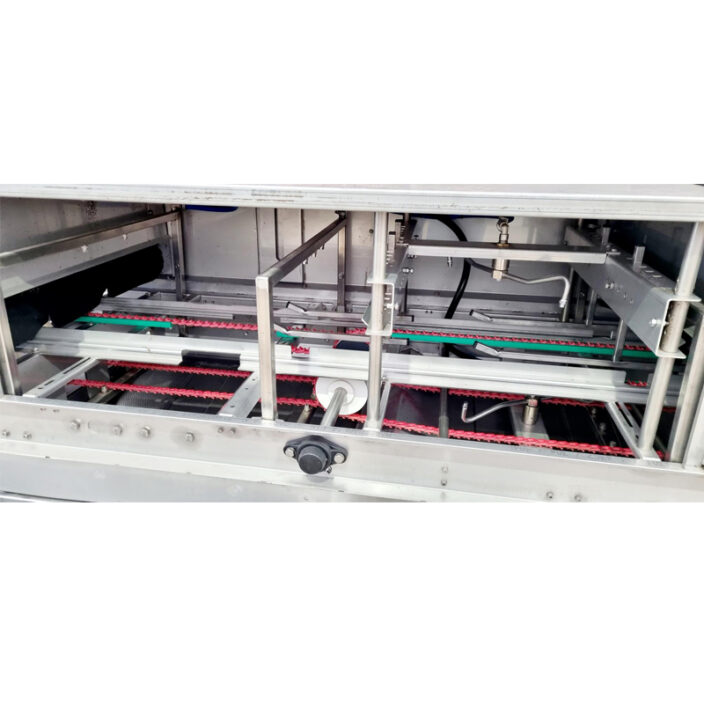 Each tray is moved in a horizontal position by a double transport belt with adjustable speed. Inside the washing tank a minimum of eight high pressure nozzles are positioned, in which at least 2 nozzles are rotating nozzles. Note, the number of nozzles depends on the type of tray to process. The water is supplied at the nozzles with a pressure between 10-12 bar. The water is continuously recycled through a large external water filter and replaced every 6-8 operating hours. The washing tank is provided with a water input fitting, two drains and an overflow outlet.