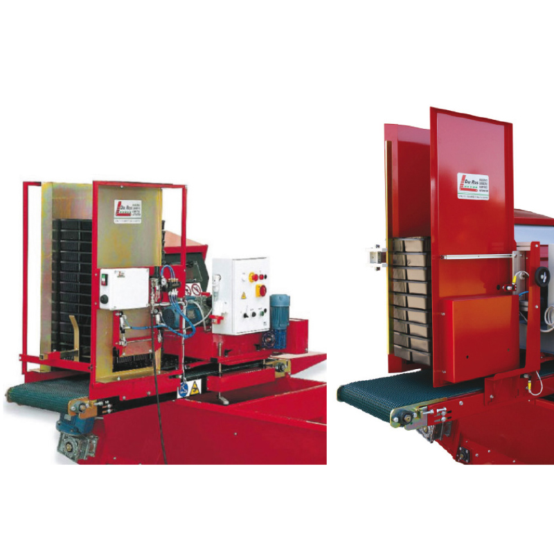 Automatic de-stacking of plastic trays (e.g. seed crates) as well as pots in shuttle trays, also suitable for retrofitting already existing seed drills. The destacking unit is placed on the conveyor belt of the tray filling machine. Modifications for high trays (tree nurseries / forestry) are available.
