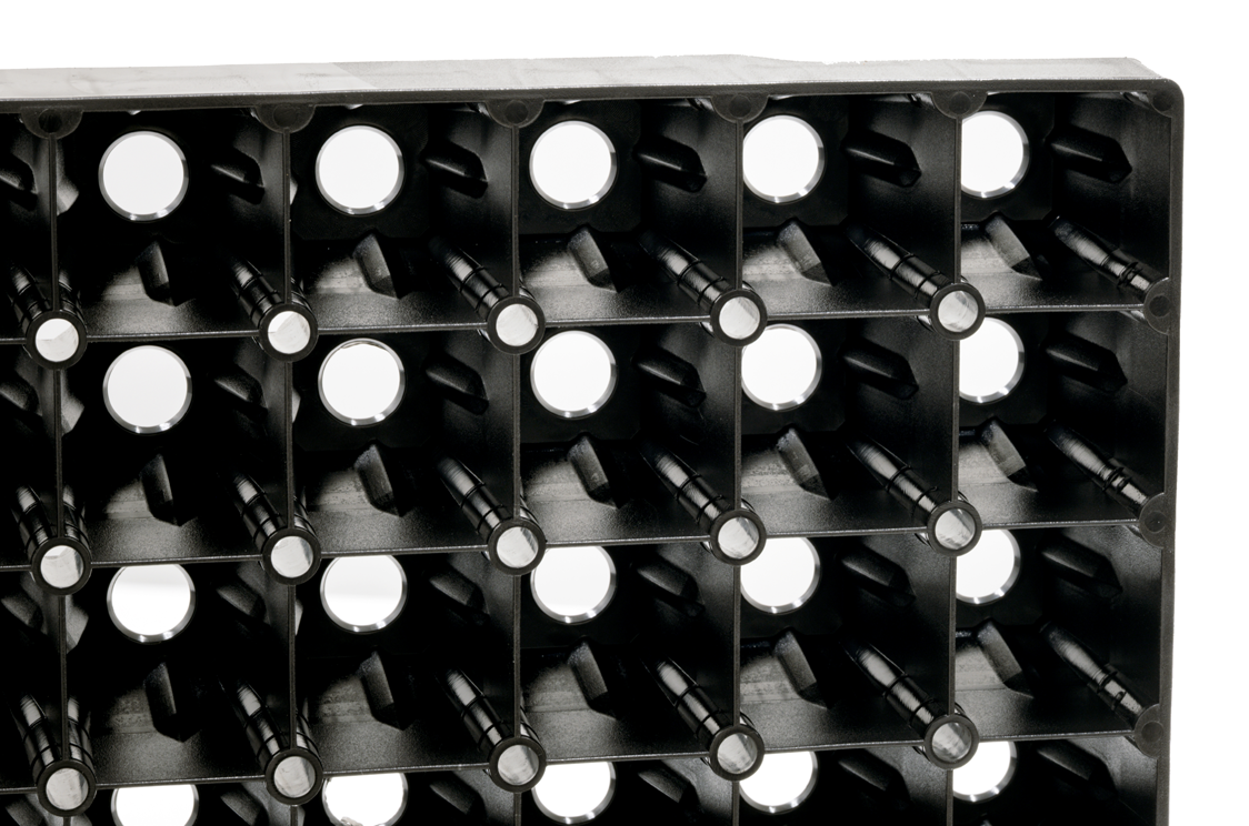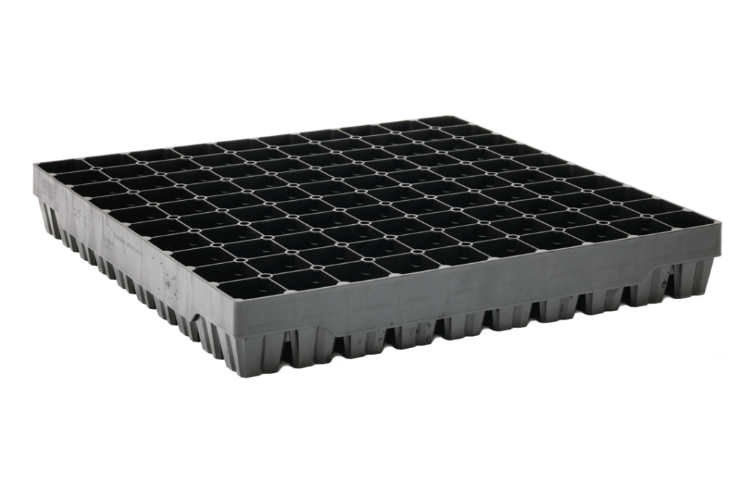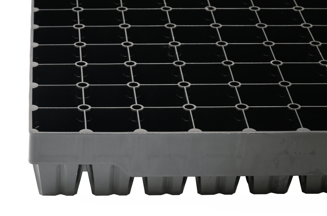 This tray grows larger seedlings for commercial vegetables or cut flower growers. The rootball is square and flat and will position correctly in open furrows or NFT systems. This is an exceptionally robust tray, it is stackable and suitable for any mechanical movement. All edges are smooth and suitable for manual handling when needed.