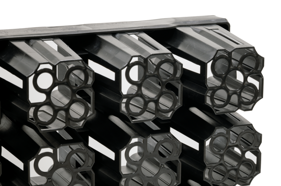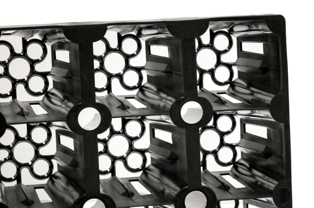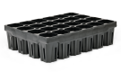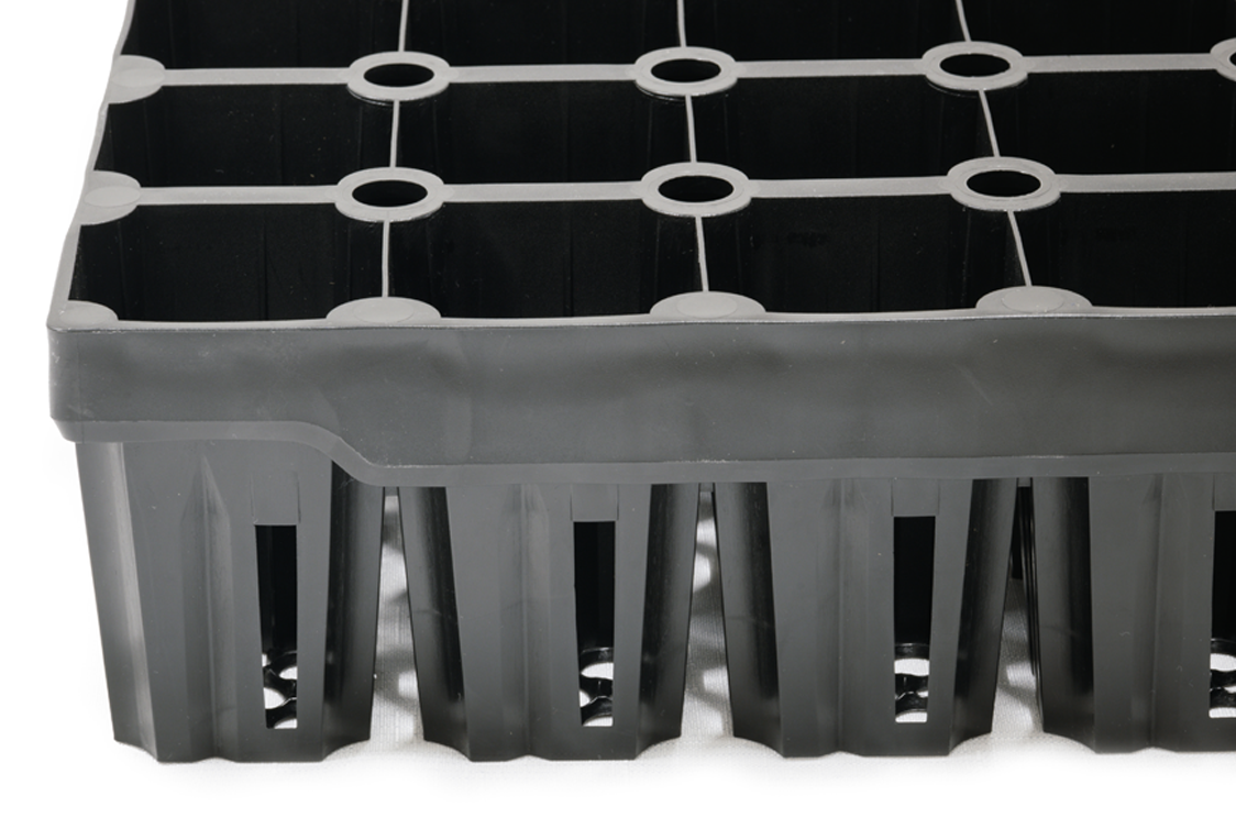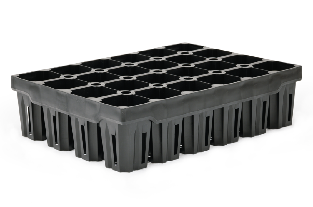 This tray is our newest produced in response to interest from landscape operators, forestry companies and leading nurseries anticipating increasing mechanisation of nursery workflow. The tray has large 292cc cells with larger side slots and ventilation holes across the surface of the tray. The cell has a media catch grid comprising a centre hole plus 4 additional holes to guide root growth evenly.