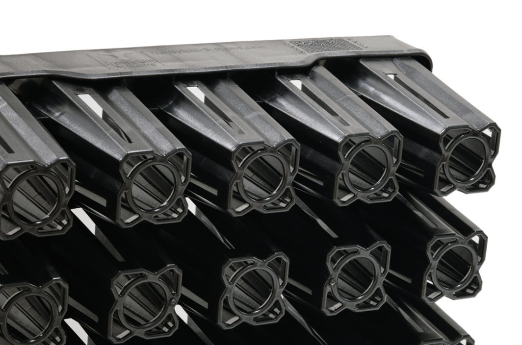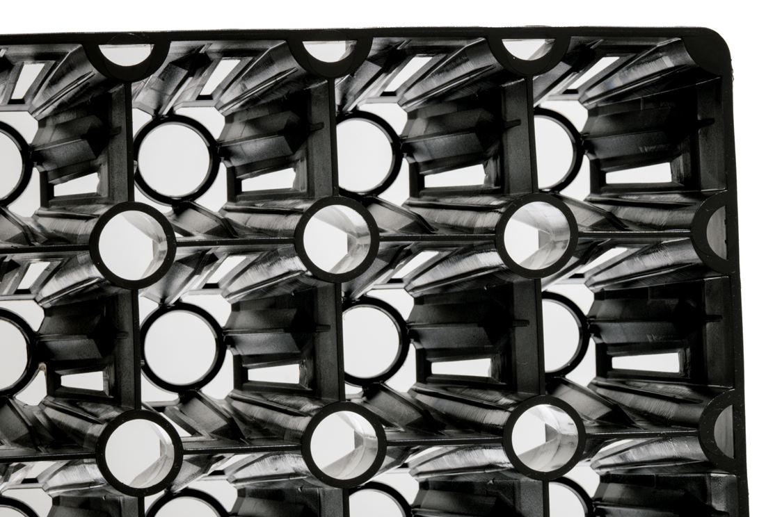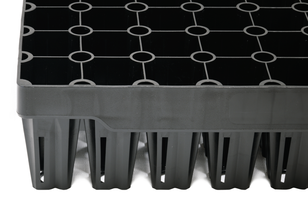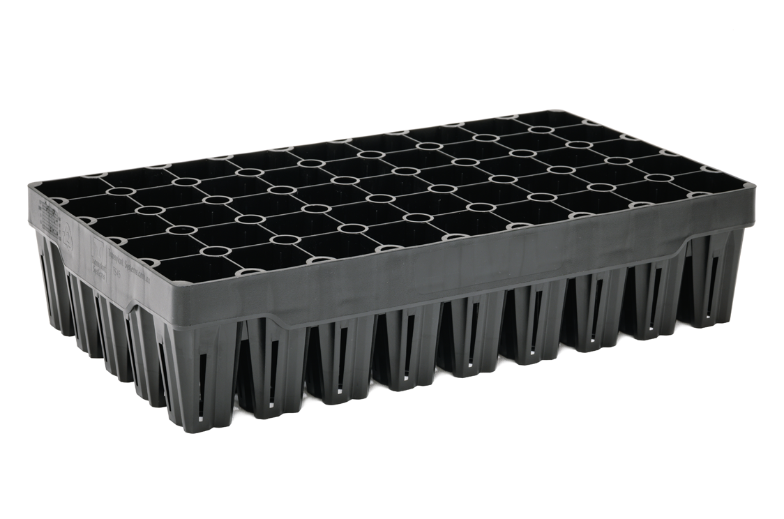 The TS-45F Forestry Tray is the most versatile in our range of forestry trays. Made in Australia from HDPE (High Density Polyethylene) virgin resin with UV protection, the trays are ideally suited for softwood and hardwood seed and mini-cuttings. Biological benefits are evident in the cell architecture (developed together with Hancock and Arborgen nurseries in Australia). The cells are specially formed to ensure complete absence of root curl. When lifted, the seedling rootball exhibits excellent form, with groups of air pruned root tips positioned to engage the surrounding soil after planting. The square shaped cells of the tray have one horizontal air pruning slot on each wall surface to lessen the drying effect common with many earlier side slot cell trays. The internal construction of the cell is designed to encourage formative root growth to enter the air pruning slot positions and encourage well positioned lateral roots. In each square cell there is one tapered lateral root air pruning slot. At the lower end of the cell, the area is wide allowing free exit of emerging roots and eliminating the problem of lower bunching of leader roots at the bottom of the cell.