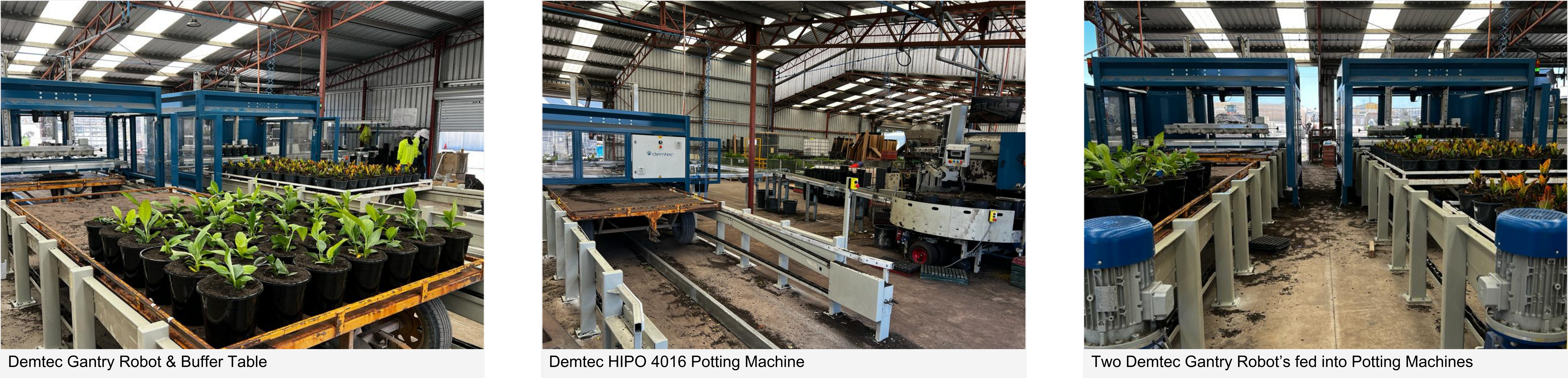 For enhanced nursery operations, this facility partnered with Transplant Systems to introduce a specialised Demtec Automated Potting Line. This advanced Potting Line includes; Two Gantry Robots, an Evo² Potting Machine, a HIPO 4016 Potting Machine, and a Den 10m² Soil Hopper, designed to streamline their nursery production.