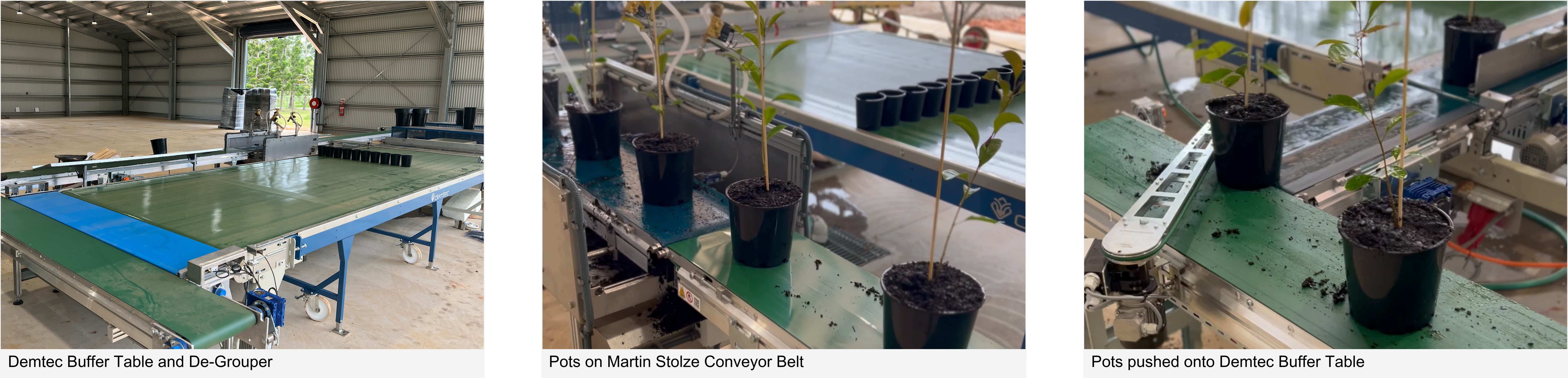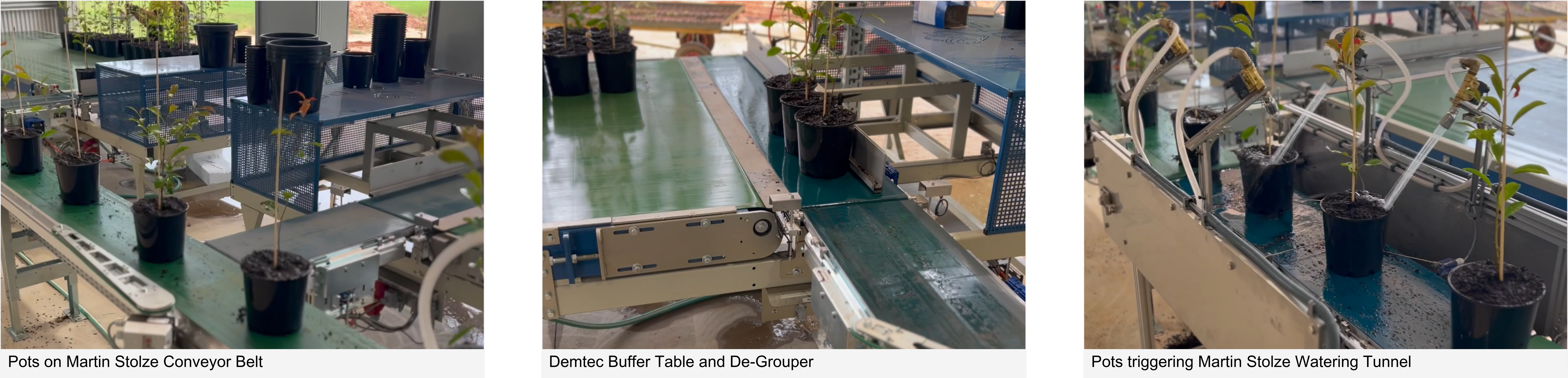 The customer sought an integrated solution for production grading and sorting within a single system, and the tailored solution was the fusion of Demtec’s Potting Machine and Buffer Tables with Martin Stolze watering and handling equipment. This comprehensive system includes a watering tunnel, two buffer tables (one equipped with a de-grouper), and conveyor belts.